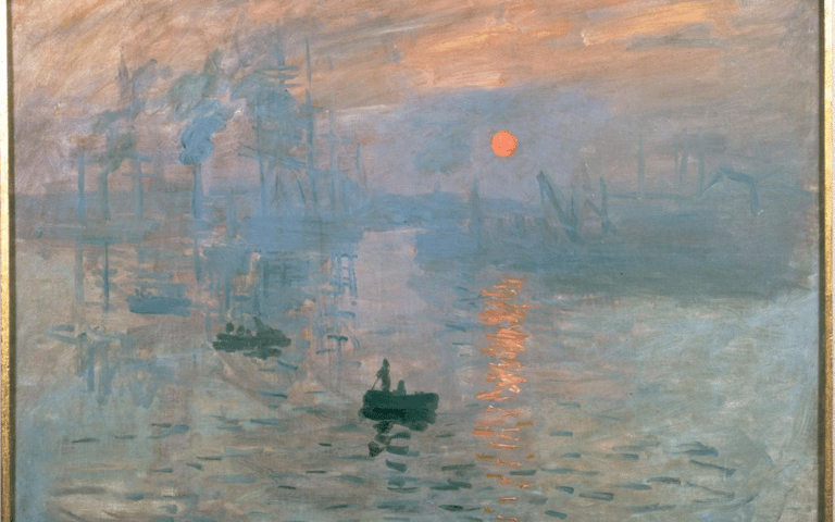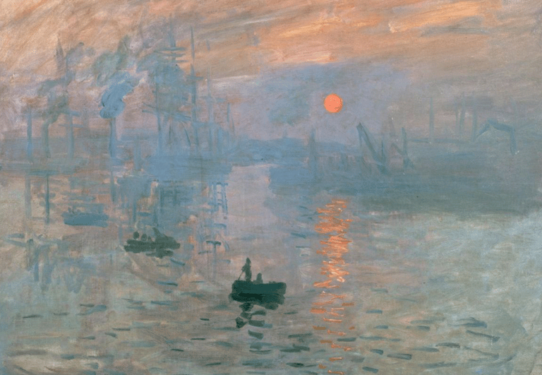 En 1874, il participe à la première exposition impressionniste. Son tableau Impression, soleil levant donne son nom au mouvement. Monet rompt avec la peinture traditionnelle en utilisant des touches rapides, des couleurs claires et une observation directe du paysage. Il peint souvent en séries — cathédrales de Rouen, meules, peupliers — afin de saisir les changements de lumière au fil du temps.