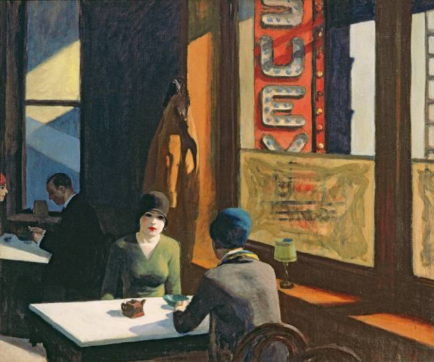 L’un des aspects les plus frappants de la peinture de Hopper est l’usage de la lumière. Inspiré à la fois par le réalisme et par le cinéma, il utilise des contrastes marqués entre ombre et clarté pour structurer la composition et instaurer une atmosphère particulière. La lumière, souvent artificielle ou rasante, ne réchauffe pas les scènes : elle isole les figures, accentue les distances et renforce le sentiment de solitude. Les personnages, quand ils sont présents, semblent absorbés dans leurs pensées, rarement en interaction les uns avec les autres.